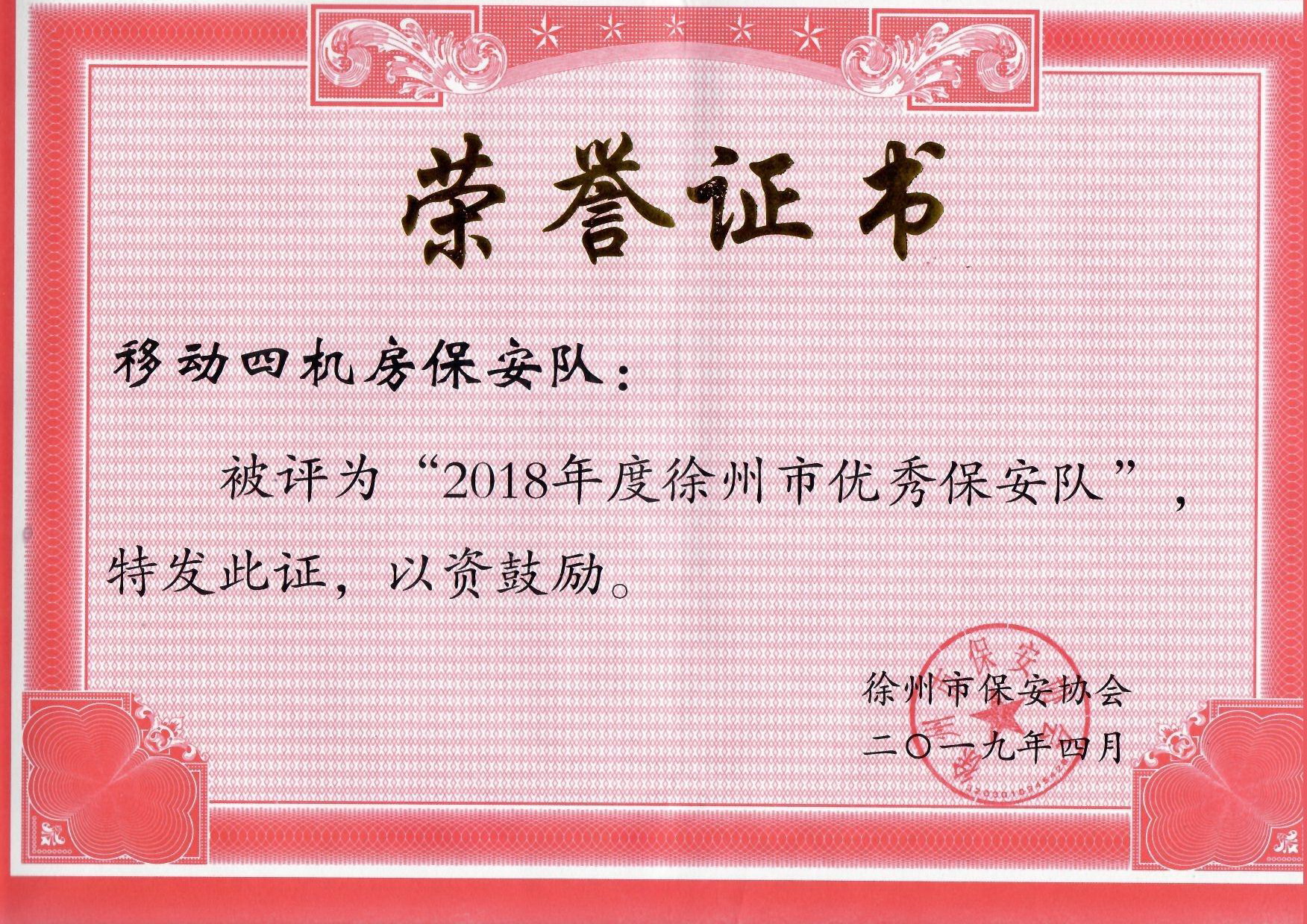 移动四机房保安队荣获“2018年度徐州市优秀保安队”称号